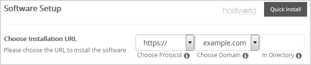 - Choose Installation URL: Choose the appropriate protocol/domain. Inside the “In Directory” field, should you want to install this in a directory, i.e., example.com/directory, enter the directory name. Otherwise, leave it blank to install in your main domain, i.e., example.com