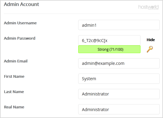 7. Under the Admin Account field, enter the following information: