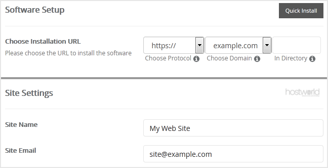 - Choose Installation URL: Choose the appropriate protocol/domain. Inside the “In Directory” field, should you want to install this in a directory, i.e. example.com/directory, enter the directory name. Otherwise, leave it blank to install in your main domain, i.e. example.com