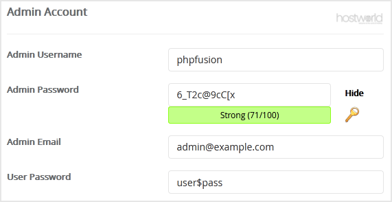 - Admin Username: Your new PHP-Fusion username (for security reason do not use the Administrator or the Admin username.)