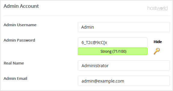 - Admin Username: Your new Xoops username (for security reason do not use the Administrator or the Admin username.)