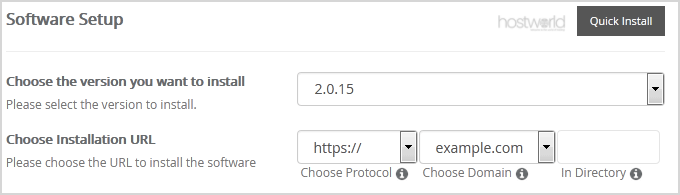 - Choose Installation URL: Choose the appropriate protocol/domain. Inside the “In Directory” field, should you want to install this in a directory, i.e., example.com/directory, enter the directory name. Otherwise, leave it blank to install in your main domain, i.e., example.com