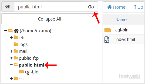 4. Navigate to the directory where you want to upload your files. For example, should you wish to upload your file to the public HTML folder, you need to go to /public_html first. On the left side, you can see a list of directories. Double Click on the public_html folder.